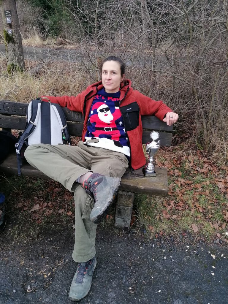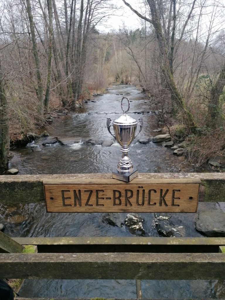 Um die Weihnachtszeit einzuläuten, zelebrierten wir am 19. Dezember 2025 unsere offizielle Weihnachtsfeier. Der Tag begann mit einem ausgedehnten Frühstück im Forsthaus (sehr lecker), am Südufer des Möhnesees. Frisch gestärkt wanderten wir von dort aus durch den schönen Arnsberger Wald. Entlang des malerischen Referenzgewässers „Heve“ führte uns unser Wanderführer „Gockel“ über den Rennweg, mit Blick auf die elf neu errichteten Windkraftanlagen, zurück zum Büro nach Allagen. Um das erfolgreiche Arbeitsjahr 2025 und den kürzlich errungenen Pokal für den Titel der fittesten Firma des Kreises Soest zu feiern, durfte neben wärmenden Heißgetränken das silbern schimmernde Prachtstück nicht fehlen. Ganz nach dem Motto: „Wandern mit dem Wanderpokal“.