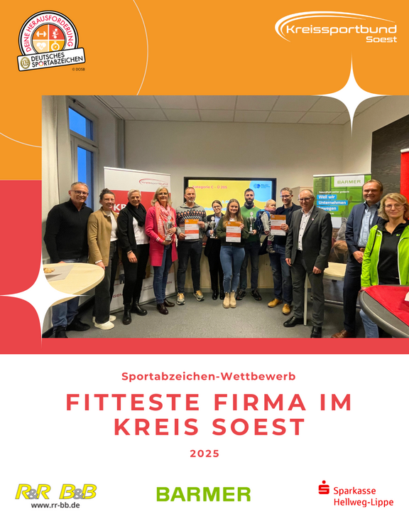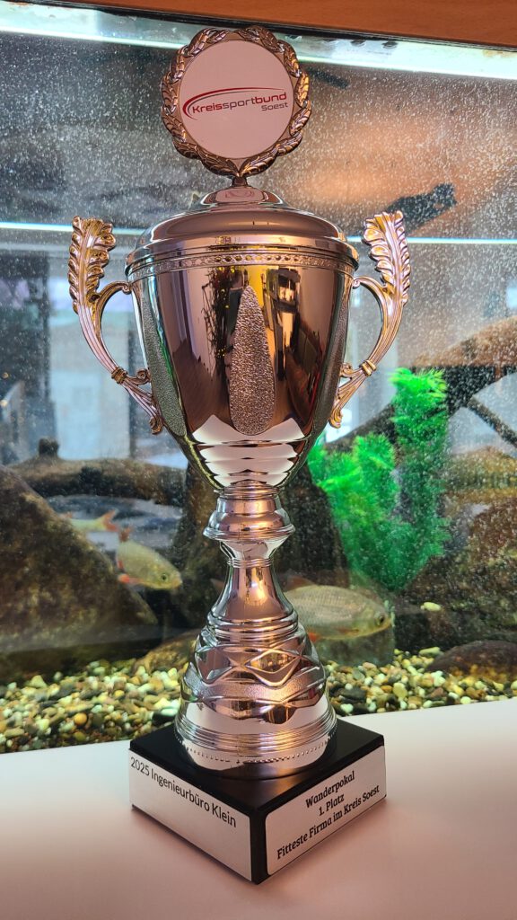 Das Ingenieurbüro Klein wurde für das erfolgreiche Absolvieren des Deutschen Sportabzeichens, mit einer beeindruckenden Teilnahmequote von 100%, als fitteste Firma des Kreises Soest ausgezeichnet. Am 25.11.2025 wurde der ehrenvolle Pokal von Jan Storp und Konrad von Bonin, stellvertretend für das gesamte Ingenieurbüro Klein, feierlich entgegengenommen. Nun heißt es für das Jahr 2026, den prachtvollen Wanderpokal mit Entschlossenheit zu verteidigen!